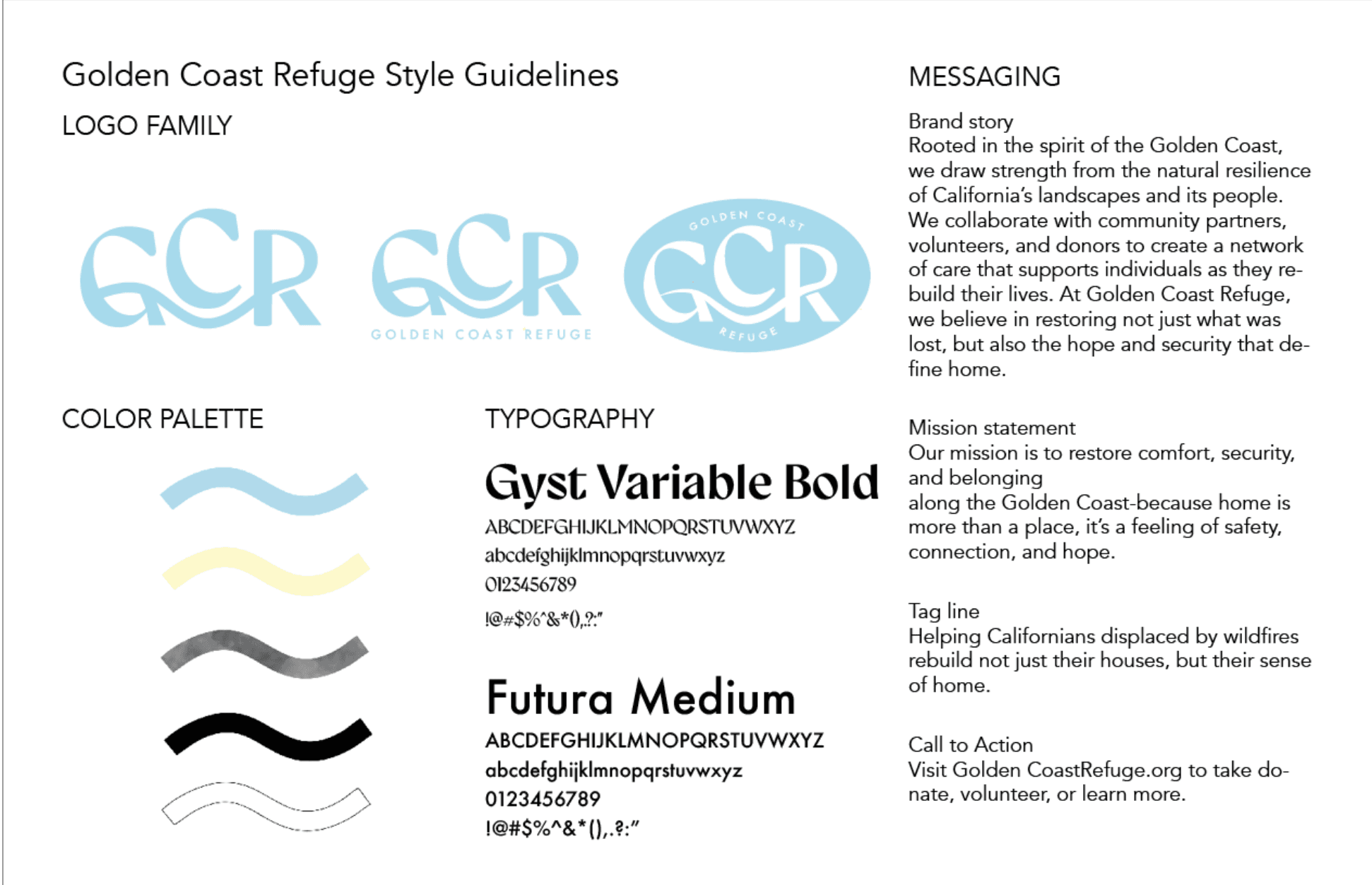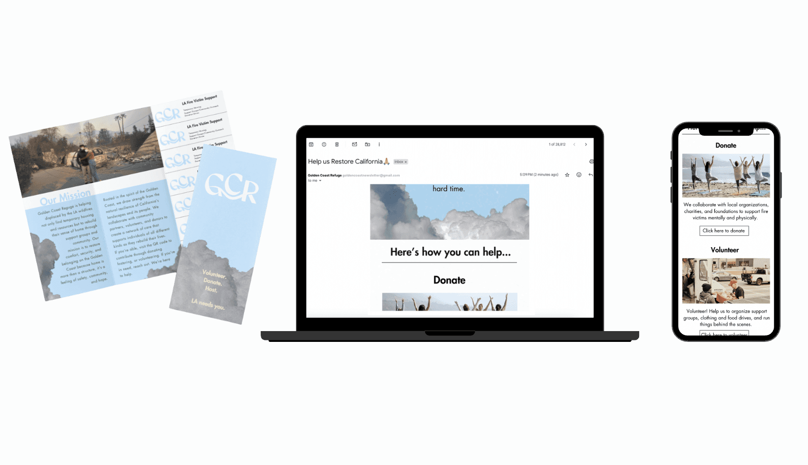 Golden Coast Refuge is a mock non-profit supporting fire victims during the Palisades Fires in 2025. As a native Californian, my community has been changed in more ways than possibly imagined. Besides the physical aspects such as burnt neighborhoods and poor air quality, the spirit and morale of Los Angeles have been severely damaged. Golden Coast Refuge aims to comfort, uplift, and support victims of the California Fires through temporary housing, support groups, and resources.